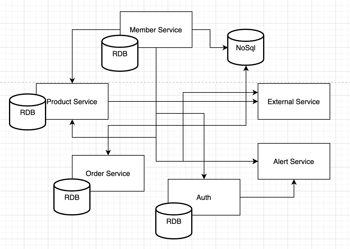 극단적인 예로 아래와 같은 MSA Service가 있다고 가정합니다.