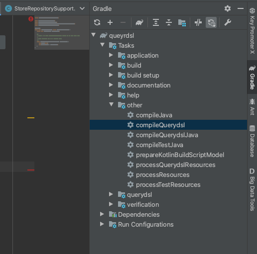 1. intellij 화면 우측에 Gradle 클릭 -> other -> complileQuerydsl 클릭하면 플러그인이 실행됩니다.