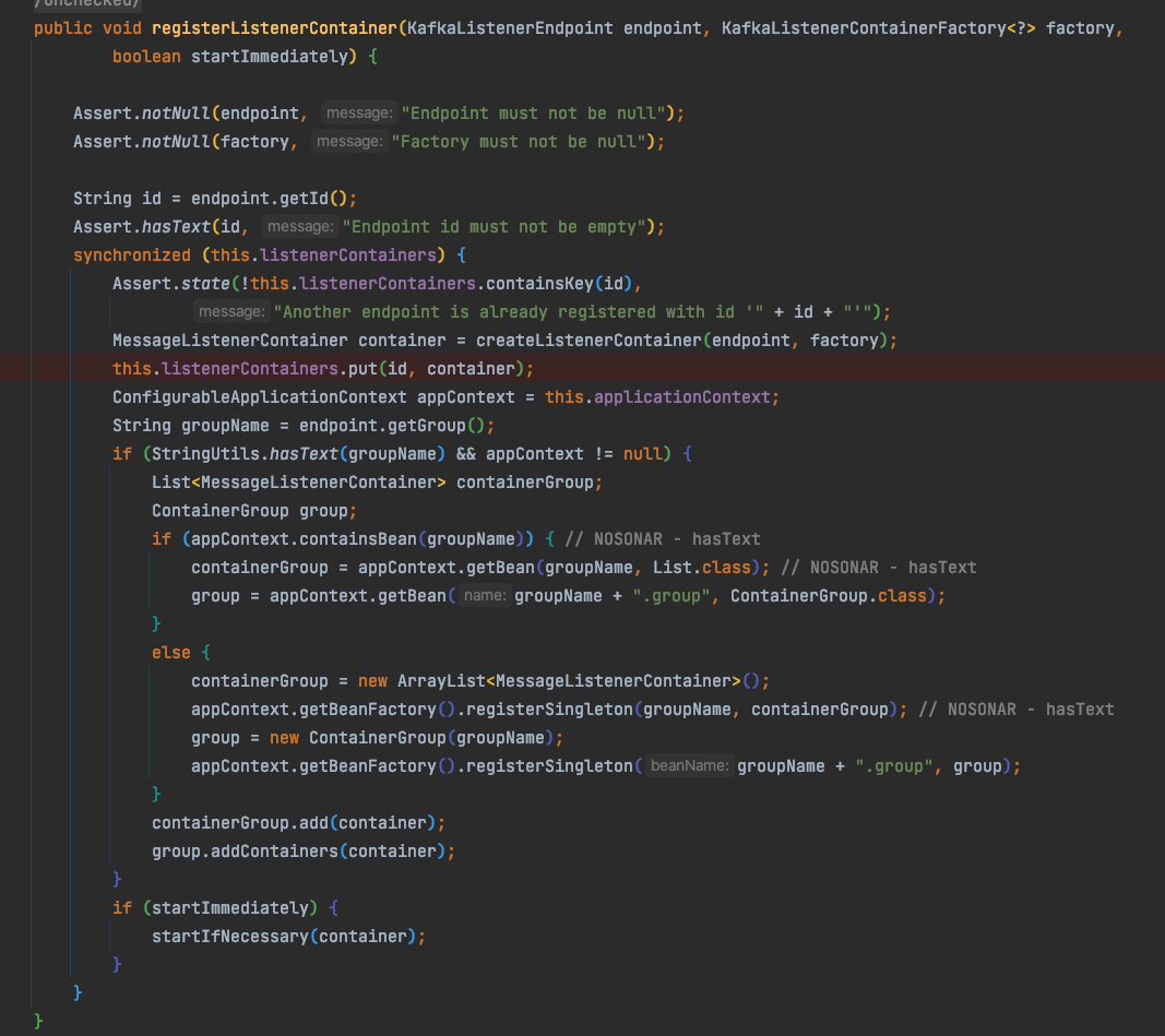 @KafkaListener는 Application Context 안에 Bean이 아닙니다. @KafkaListener는 KafkaListenerEndpointRegistry에서 Bean으로 등록이 됩니다. 등록된 Bean은 framework에 의해 자동으로 선언되고 Container의 Lifecycle을 관리합니다.