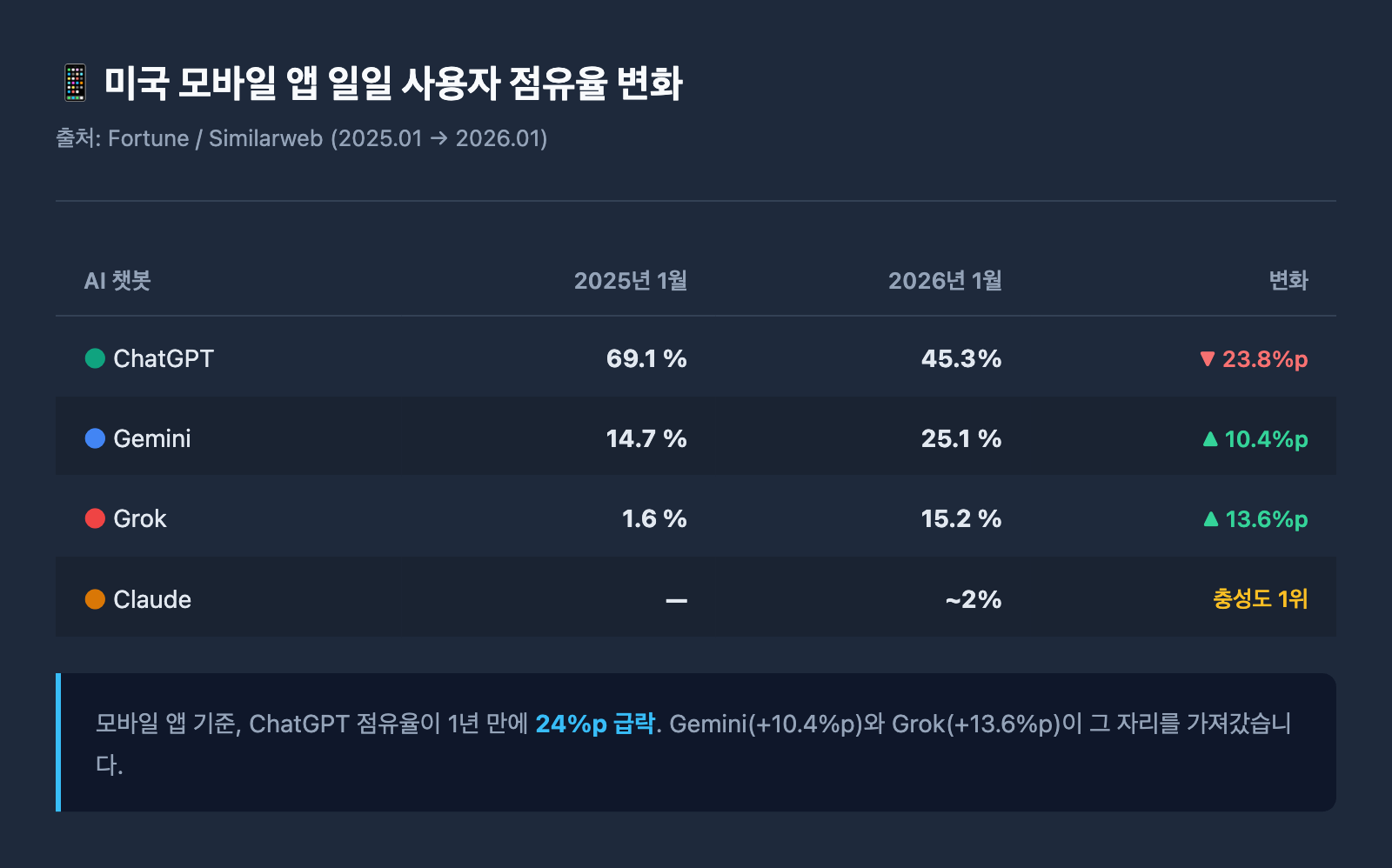 | 전체 1위 | ChatGPT (하지만 점유율 하락 중) |