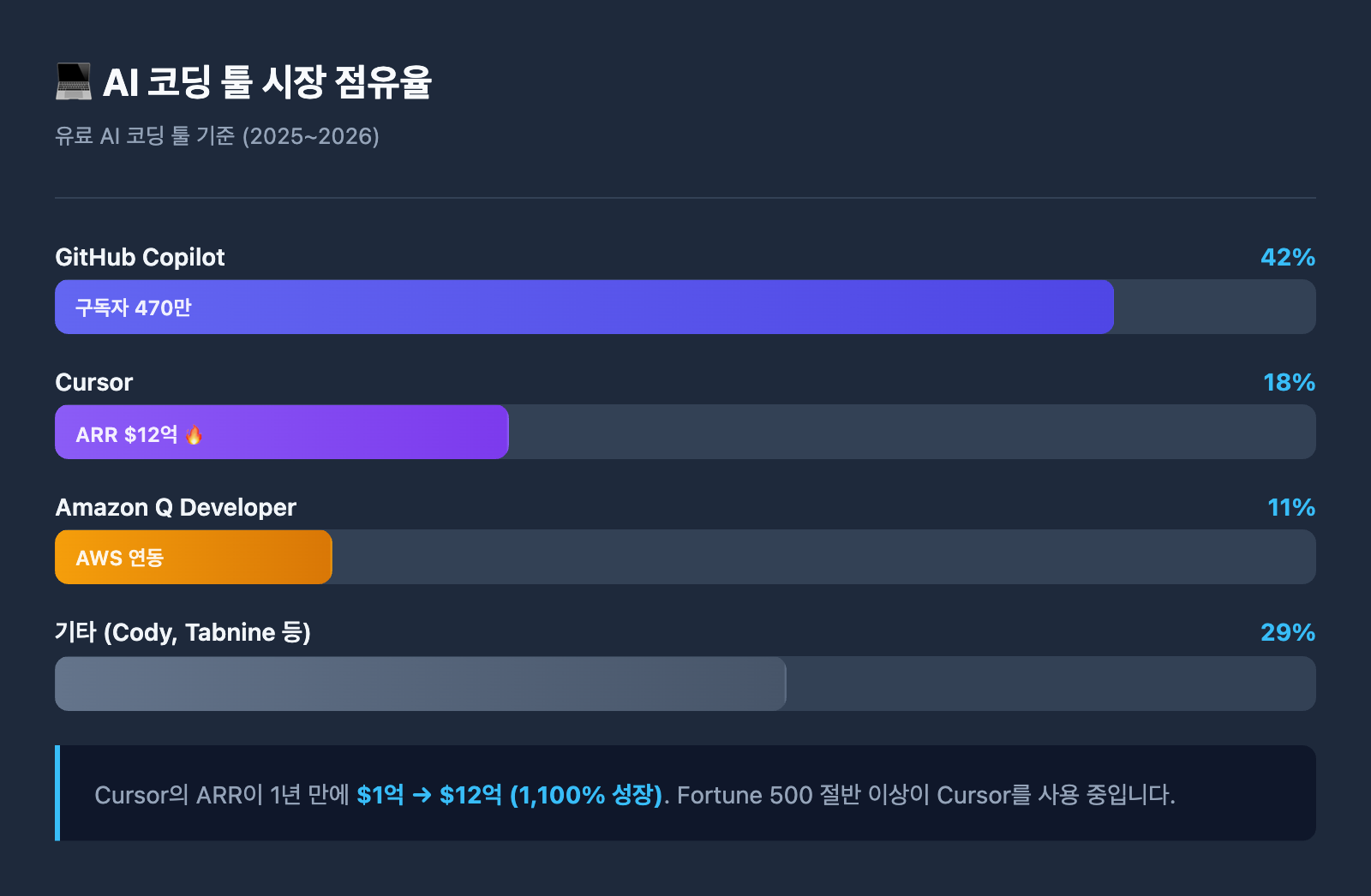 | GitHub Copilot | 42% | 구독자 470만, Fortune 100 중 90% 사용 |