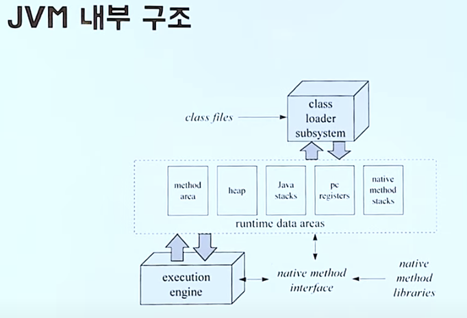 - Execution Engine : 로드된 .class 파일 ( byte code )를 해석하여 JVM 메모리에 배치시킵니다.