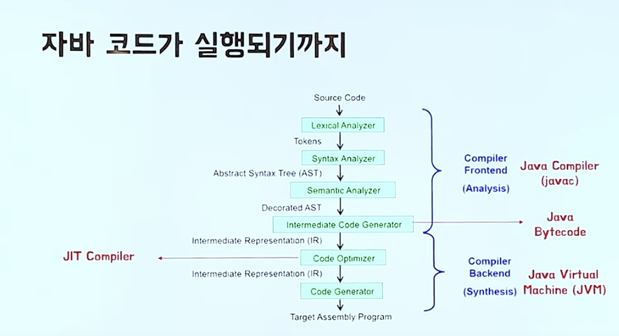 자바코드는 그림과 같이 실행되어집니다. 먼저 Frontend, Backend로 나뉘어집니다.