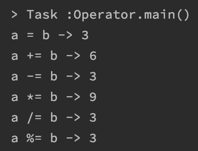 System.out.println("a -= b -> " + (a -= b)); // a = a - b