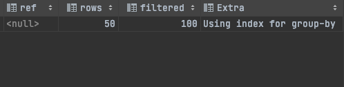 위 쿼리를 explain하면 Using index for group-by를 확인할 수 있습니다. 즉 인덱스 커버링이 적용되었다는 것을 알 수 있습니다.